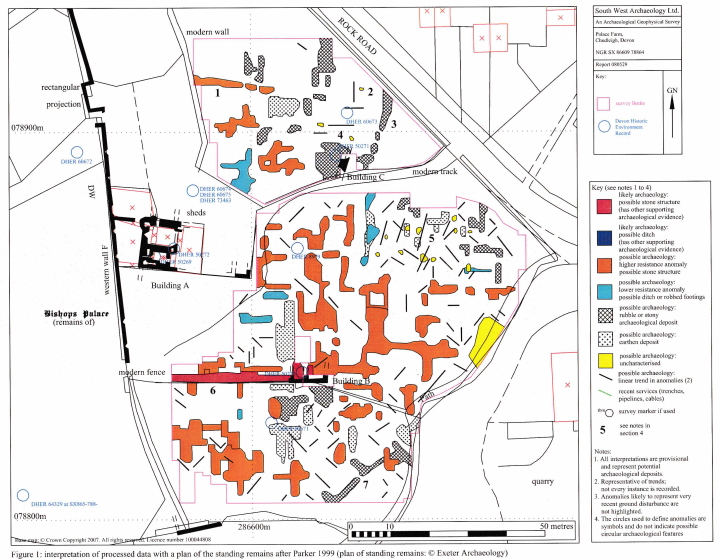 2008 In 2008, Southwest Archaeology undertook an earth-resistivity survey of the Bishops Palace site. This technique shows sub-surface features which may be interpreted as the remains of walls and ditches, etc. However, wthout physical excavation, the actual remains and layout of the palace are not proven.