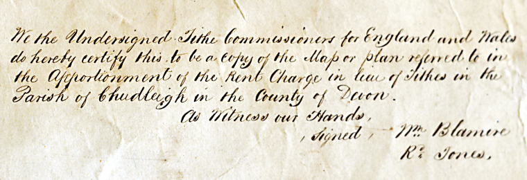 Another copy (probably the original master), available to researchers, is held at the Devon Record Office at Sowton, near Exeter. Several Devon tithe maps – including that for Chudleigh – have been scanned and can be viewed interactively from the above DRO tithes map page.