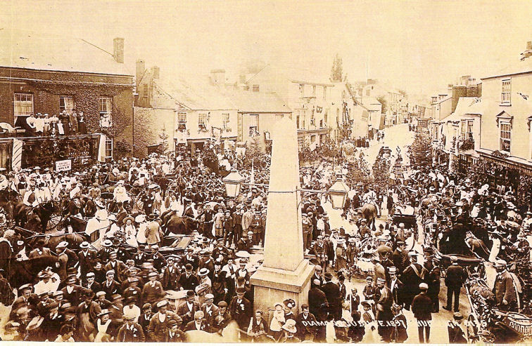 In 1875 Mary Jones published a revised edition of her history and said; 'Chudleigh consists of a principal street about half a mile in length. In the centre of the town is a vacant space where the Market House formerly stood, now supplied by a granite column'. Does this indicate the column was intended to mark the location of the original market house burnt down in 1807?. Possibly yes; the reason for the obelisk at Warminster was to replace the original market cross and mark the site of the ancient market place.