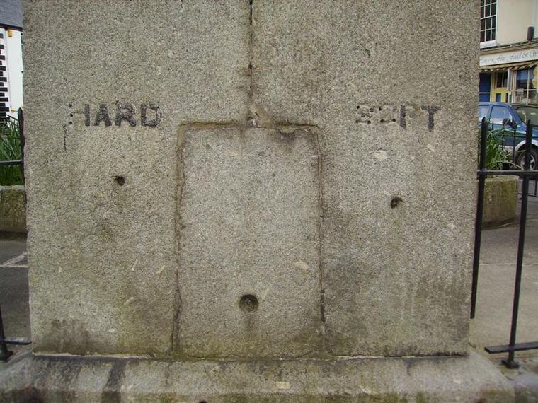 Serving the town as a water conduit from at least 1837 to the 1920s, the words 'HARD' and 'SOFT' remain, in lettering of what appear to be of lead inset into the granite low down on the north side of the rectangular base. This style of lettering probably dates, at the earliest, to about 1909/10. Note that a postcard photograph of 1901 does not show the lettering. The two sources of water would have come from the Haldon springs (hard water) and rainwater (soft water).