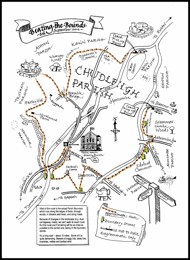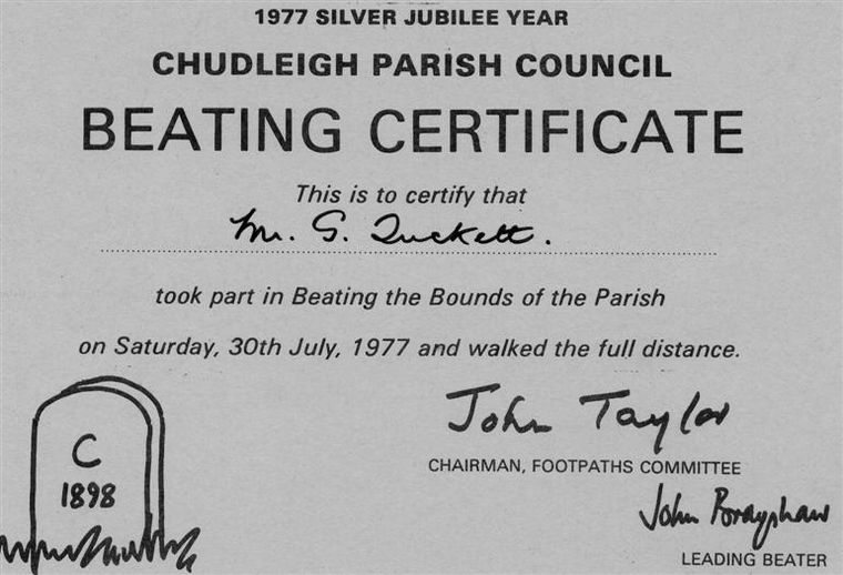 In our parish it is the custom that the boundaries are perambulated every seven years. The event is now enjoyed by many people, young and old and a large number usually participate. The event takes a great deal of organising, particularly from a health and safety point of view as our boundaries in places either cross or run along the major trunk routes (A38 and A380). The custom is that the boundary (of some 22 miles on the OS map) is walked in one day in a clockwise direction starting at Stokelake Meadow, alongside the Teign. There are a total of ten existing boundary stones, dating mainly from 1898 and 1911 with a couple being much older. They are generally inscribed 'CP' (civil parish). Apart from the River Teign, the boundary follows Bramble Brook for much of its length (to the north of Whiteway), then a line across Haldon and the racecourse to a point alongside the A380 not far from the top of Telegraph Hill. From there the boundary runs roughly south to Ideford Common, thence down to Ideford Arch, then along a short section of Gappah Lane and into Ugbrooke Park. Out of the park toward Winstow the line then passes across the top of Shepherd's Hill and back down to Stokelake Meadow (crossing the busy Exeter-Plymouth dual carriageway).