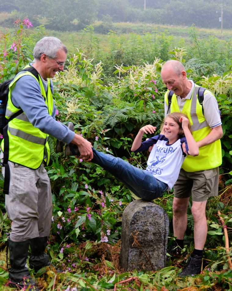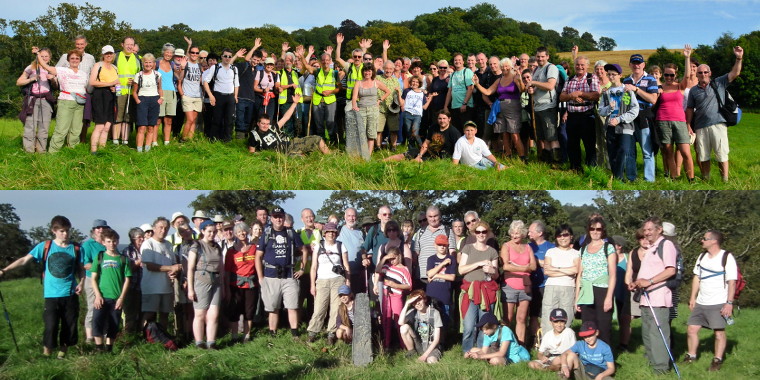 Following registration at the Town Hall the group walked en-masse to the first stone at Stokelake Meadow and after some effort found it amongst undergrowth and almost at the edge of the riverbank of the Teign. From here the party split into the two groups for the remainder of the walk. Refreshments were laid on at Trusham Village Hall in the morning and again at Exeter Racecourse at lunchtime. Coaches ferried the walkers from here over the busy A380 dual carraigeway section and the walk resumed again at Grammarcombe Wood. From there passing two stones at Ideford Common the parties descended a green lane to come out at the afternoon refreshment stop at Thorn's Cottage near Ideford Arch. From here the parties entered the grounds of Ugbrooke Park and with the guidance of Lord Clifford passed two boundary stones before leaving the park under Winstow Arch. From here a short walk to the field at the top of Shepherd's Hill where the final boundary stone was accessed. All those participating were entitled to a signed certificate and a commemorative coffee mug.