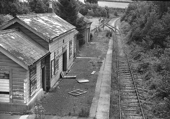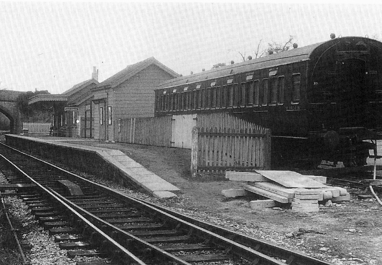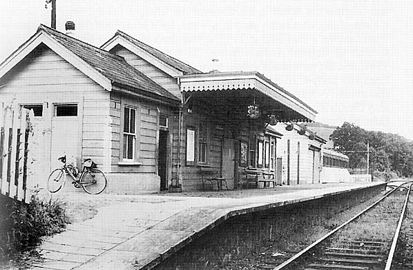 Like those on many other country branch lines in the West Country, the actual station was a fairly simple affair and consisted of a 160ft long platform, faced with granite, on the eastern side of the single track. The covering was mainly of brick, edged with concrete slabs with rounded shoulders on the line side, and it was backed throughout most of its length by a neat, white painted wooden fence of 4ft high slats, their tops cut to an apex. At the northern end, and set back only a relatively short distance from the road overbridge was the main station building, modelled directly on the station building at Heathfield, complete with canopy and an adjoining wing on either side, with a single chimney protruding from its roof. It was constructed of horizontal timber planking, covered with sand and buff paint, under a conventional pitched roof of grey slate with plain up ridge tiles (as were the two wings, which served as the gents toilet and a store/parcel room respectively, the wing nearest to the over bridge having a chimney). It had a sliding door giving access to the platform and a rear door with porch facing the forecourt. In the early years the firm Wyman & Sons Ltd, booksellers and news agent operated a small sales facility within the building.