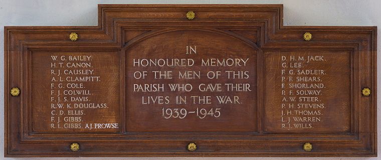 Affixed above the new tablet on the north side was a smaller tablet which carried the following inscription: The seats placed around the parish are to the memory of the men of Chudleigh who gave their lives in the 1939–1945 war. The £200 required had been raised by subscription and was allocated as £100 for the adding of the names, £90 for the seats around the parish and £10 towards the memorial within Exeter Cathedral. By April 1949 a total of twenty seats had been placed around the parish.
